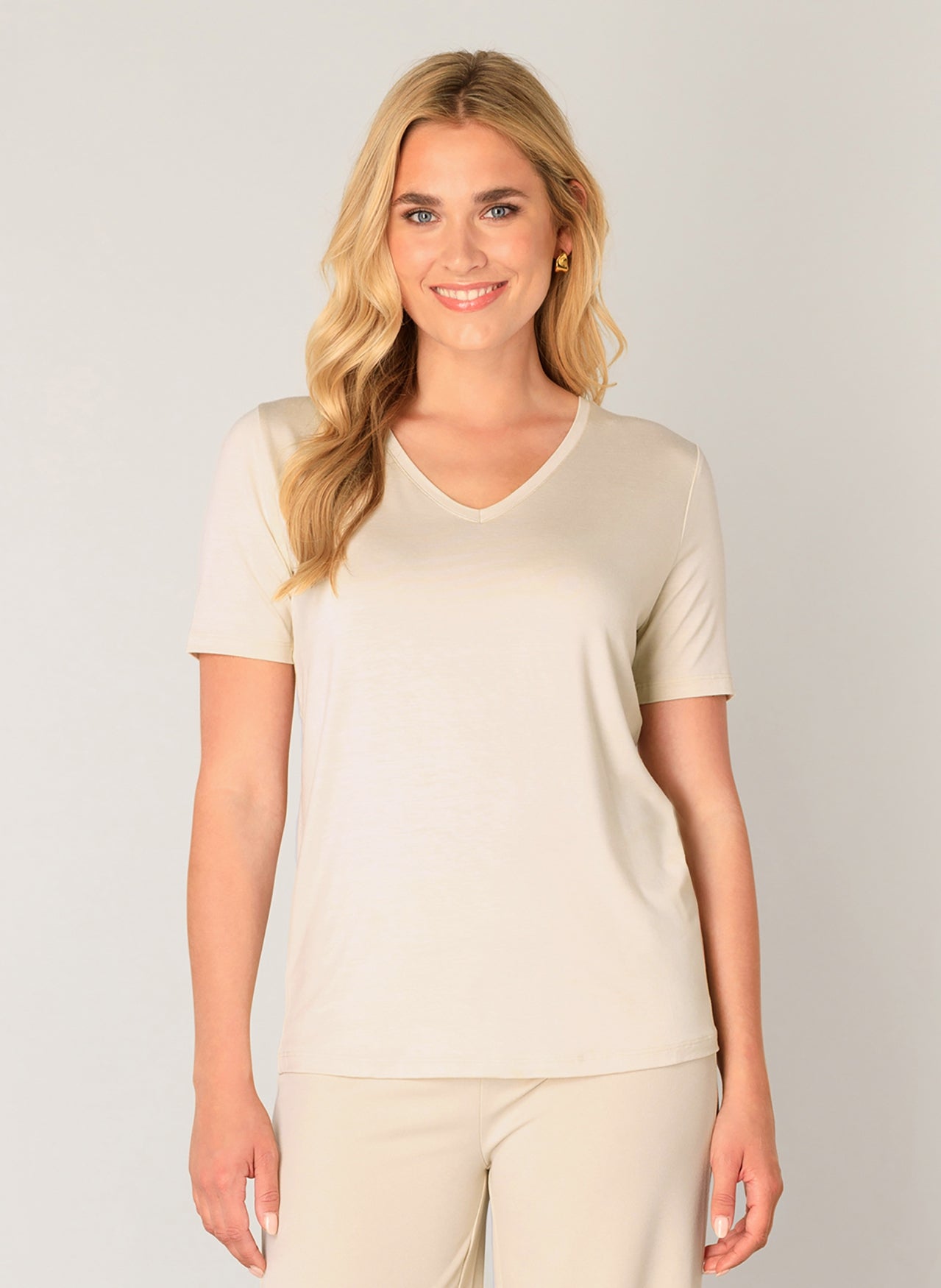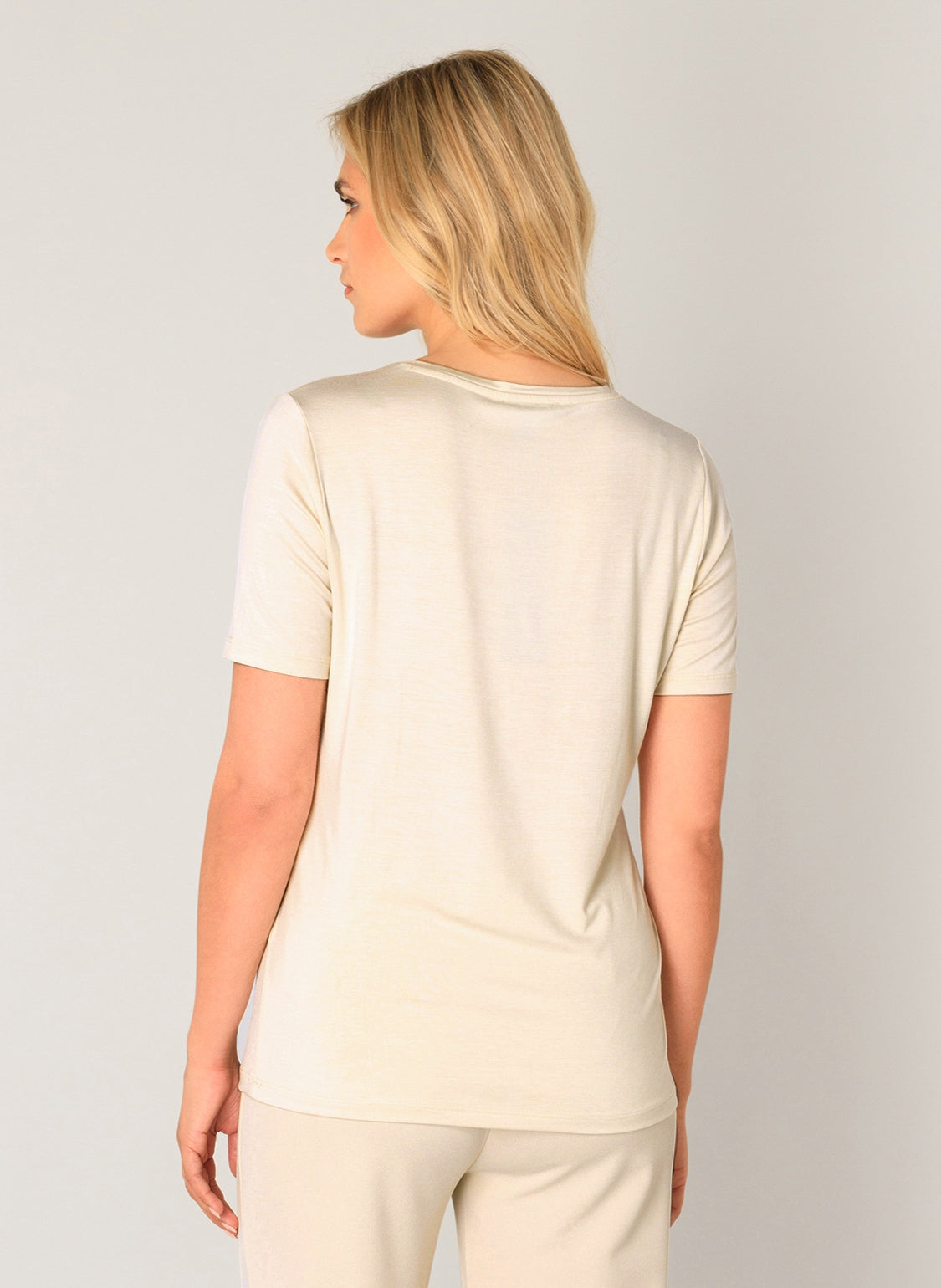 Yanic is een recht T-shirt van een soepele viscosemix met een V-hals. Yanic is verkrijgbaar in de kleuren white, light beige, dark blue en black.