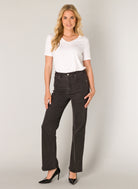 Amy ist eine High-Rise/Wide-Leg Fit Five-Pocket-Jeans aus einem elastischen Baumwollmix. Die Hose hat weit ausgestellte Beine und einen Reißverschluss- und Knopfverschluss. Die Hose ist in 30 und 32 Zoll erhältlich.