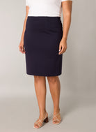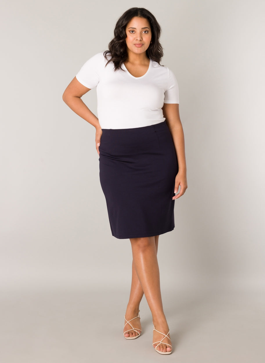Amily ist ein knielanger, taillierter Bleistiftrock. Er hat einen elastischen Bund und ist aus einer robusten Viskosemischung gefertigt. Amily ist in den Farben Dunkelblau und Schwarz erhältlich.