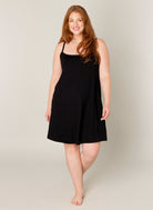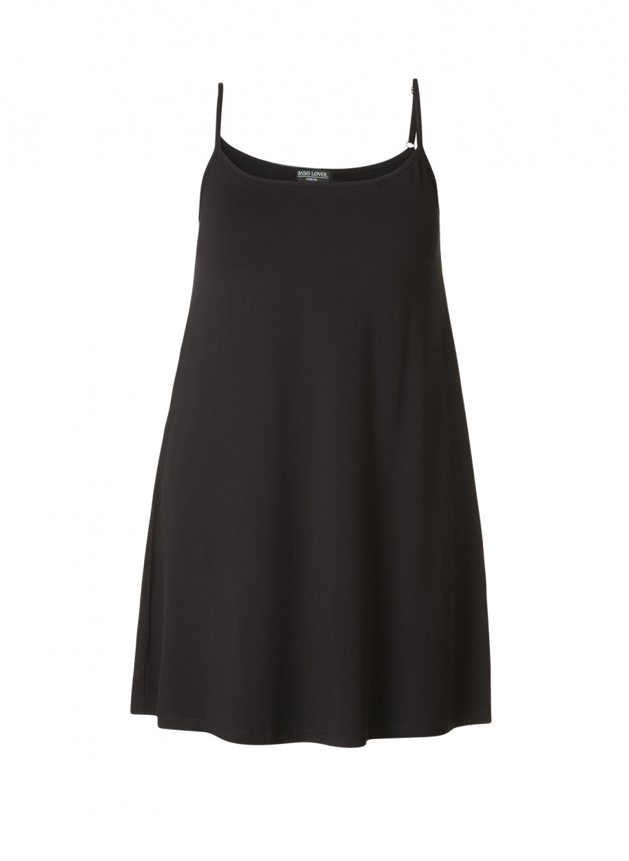 Alissa A-Linien-Kleid aus einer weichen Jersey-Viskose-Mischung. Das Kleid hat schmale, verstellbare Schulterträger und einen runden Ausschnitt. Es fällt bis zum Knie. Alissa ist in Dunkelblau und Schwarz erhältlich.