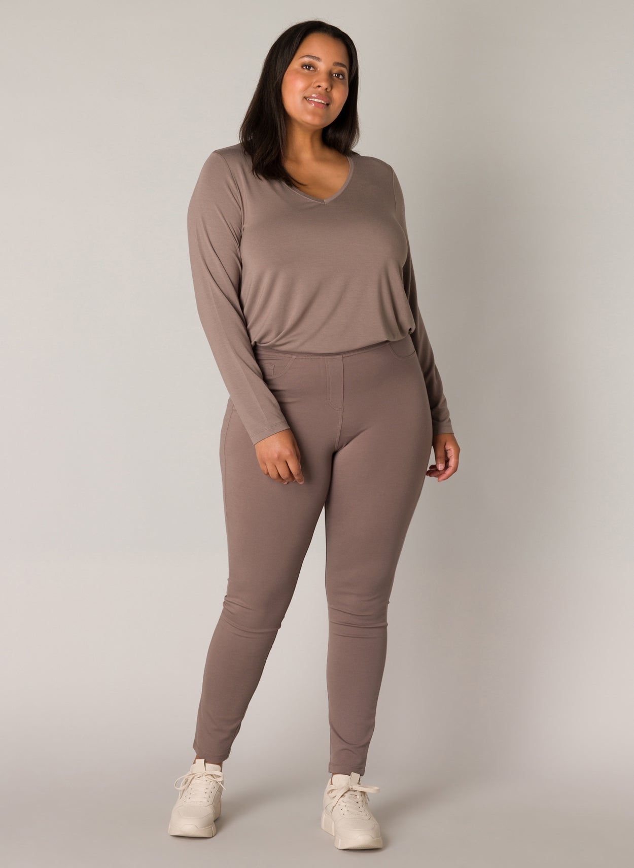 Arnika ist eine taillierte Treggings in robuster Stretch-Jersey-Qualität, mit aufgesetzten Taschen auf der Vorderseite. Die Länge beträgt 29 Zoll. Arnika ist in hellbeige, dunkel taupe, dunkelblau und schwarz erhältlich.