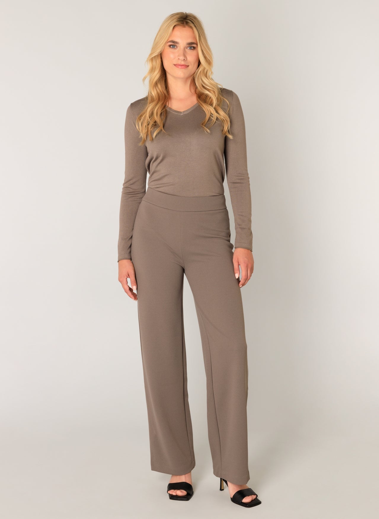 Yarah is a wide-leg trouser in recycled polyester with an elasticated waistband and closed welt pockets on the back panel. Yarah is available in light beige, dark taupe, dark blue and black.