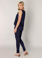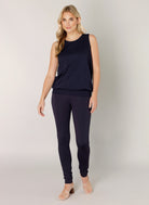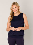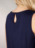Yasmin is a sleeveless top crafted from a soft viscose blend. It features a round neckline, a button closure at the back, and a wide hem band that creates a flattering blouson silhouette. Available in white, black, and dark blue.